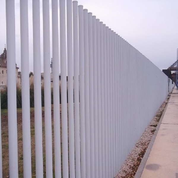 Fabricada con tubos redondos galvanizados de 80 mm. de diámetro y 2 mm. de espesor, colocados a 12 cm de separación, soldados sobre pletina de 120x10 mm. Está provista de seis taladros para fijar mediante tornillos HRD de 10X180 mm en módulos de 2 metros de largo por 2 metros de altura.